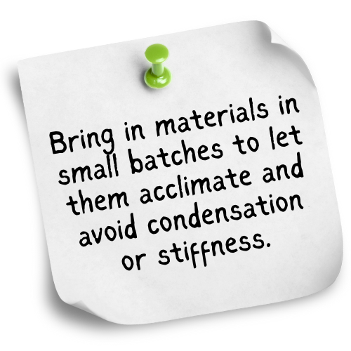 One of the biggest winter mistakes we see is skipping material acclimation. Materials stored in cold trucks or storage areas become stiffer, making them harder to handle and affecting adhesive performance. Installing before materials have adjusted to the room temperature is a common cause of winter failures.